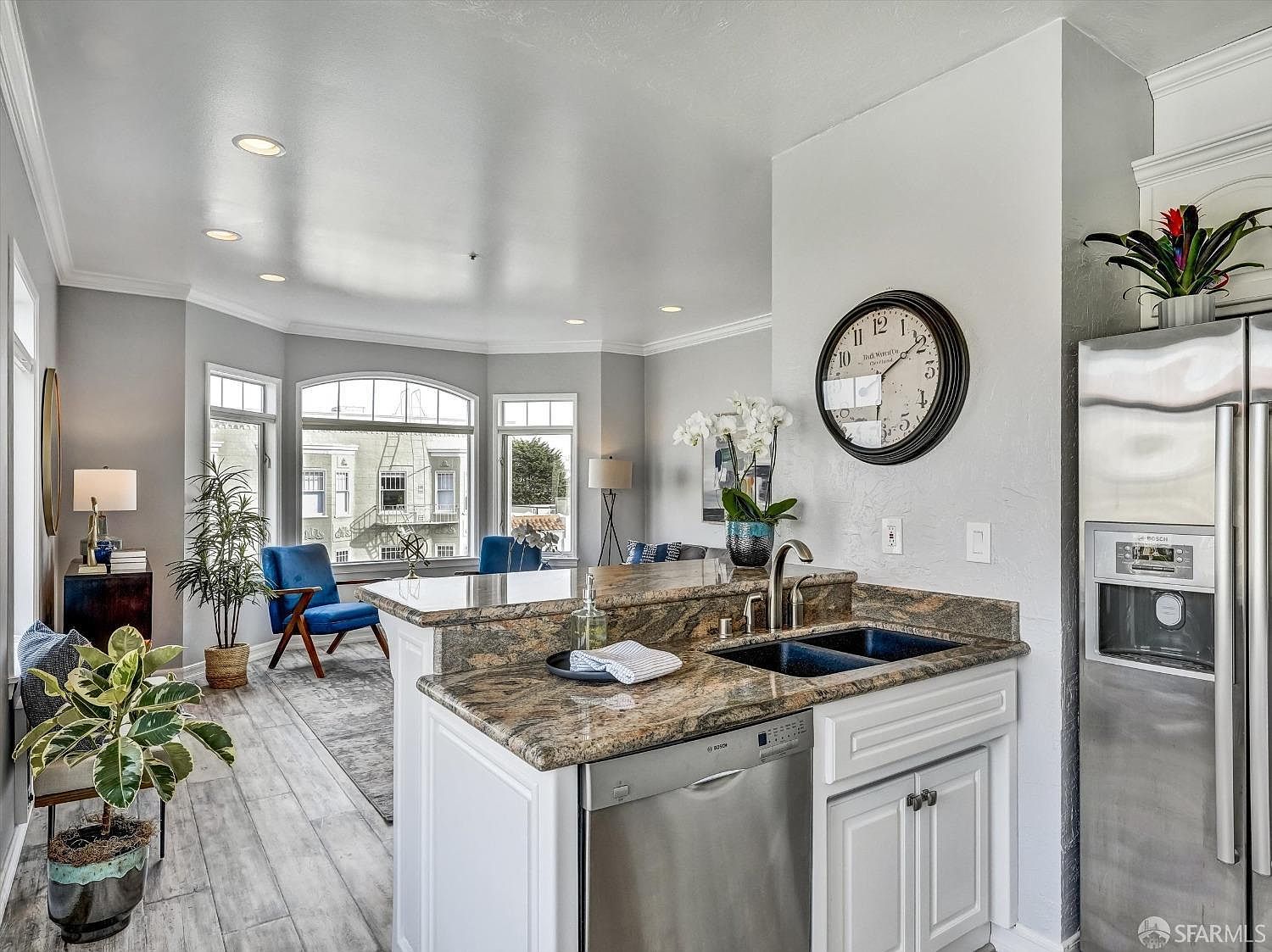 This corner top-floor Marina condo commands captivating views of the Bay from large, bright living area windows, with a downtown panorama visible from both the living space and the spacious primary bedroom with en-suite bathroom. The open living, dining, and kitchen area features attractive modern flooring and a gourmet kitchen with bar seating, wine storage, granite countertops, and quality stainless steel appliances. A second bedroom offers a charming glimpse of the Golden Gate Bridge, with a second bathroom conveniently located off the foyer. One-car parking, a storage cabinet, and building laundry on the same floor add everyday ease. The superb location puts Chestnut Street's dining, shopping, and socializing within an easy stroll, while the Marina's waterfront, the Presidio, the Bay, and the iconic Palace of Fine Arts await outdoor enthusiasts just beyond the front door.