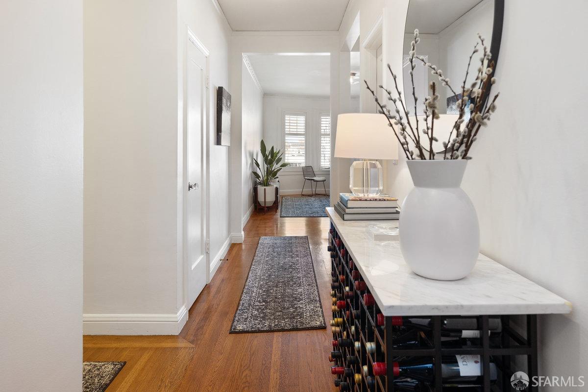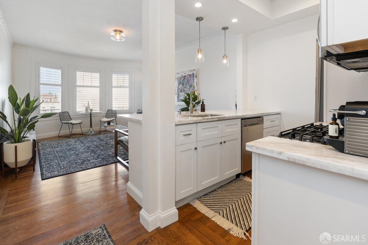 Set in a charming 14-unit building in the Marina, this TIC residence offers a distinctive urban living experience surrounded by beautiful streets and historic architecture. The tastefully updated kitchen features elegant marble countertops, complemented by beautiful hardwood floors throughout. A spacious living room with western exposure invites gorgeous sunsets and wonderful natural light. Ample closet space and in-unit washer and dryer add daily convenience. A rooftop deck delivers panoramic views, while the shared garden and BBQ area—with seating amidst colorful plants—offers a peaceful retreat. The building is pet-friendly, and from the living room, you might catch glimpses of San Francisco's famous wild green parrots. Secure parking within the building is included. Fort Mason, Moscone Park, and Chestnut Street's shops, restaurants, and nightlife are all a short stroll away.