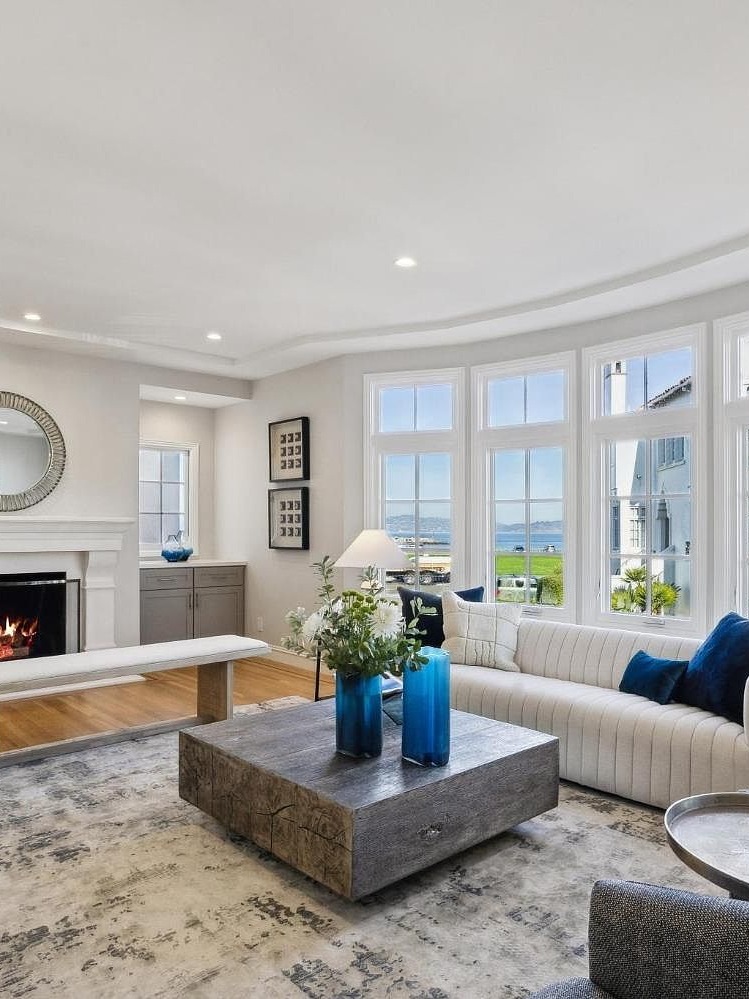 Built in 1925 and extensively remodeled, this grand Marina-style residence spans approximately 2,665 square feet across two levels. The full-width living room opens directly to views of the Marina Green and San Francisco Bay, with gorgeous inlaid hardwood floors, a fireplace, and recessed lighting setting an elegant tone. Double doors lead to a formal dining room and a chef's kitchen outfitted with a Viking gas range, quartz counters, and marble tile backsplash. The main level includes a generous primary suite with a luxury marble bath, two additional bedrooms, and a second fully remodeled bathroom. On the garden level, a large family room suite, home office, and spa-like bathroom with soaking tub, custom tile shower, and dual vanity open to an exclusive-use rear landscaped garden and patio. A laundry room, one-car parking, and storage round out the home. The location is ideal—directly across from the Marina Green and moments from Crissy Field, East Beach, the Presidio, Fort Mason, and the shops and restaurants of Chestnut and Union Streets.