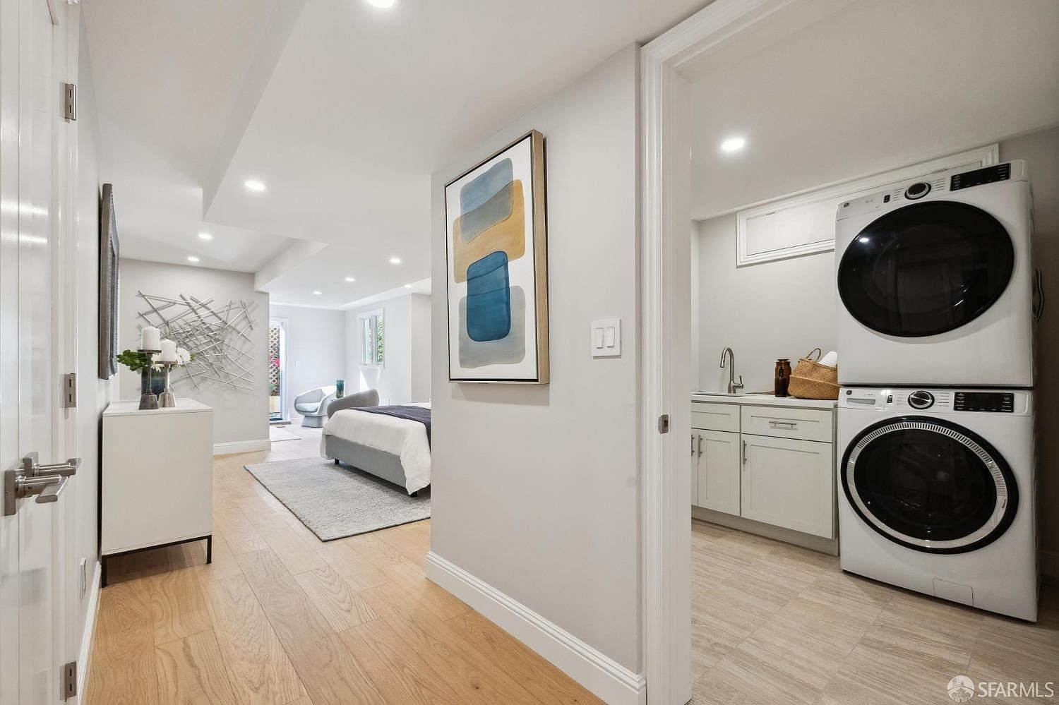 Directly across from the Marina Green, the full-width living room captures sweeping Bay views that shift with the light throughout the day. The garden-level suite with its private landscaped patio creates a self-contained retreat within the home—perfect for guests or a home office.